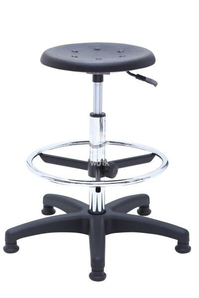 Obrotowy wysoki taboret laboratoryjny. Antypoślizgowe siedzisko wykonane z miękkiego poliuretanu. Regulacja wysokości siedziska za pomocą podnośnika pneumatycznego. Podnóżek okrągły. Podstawa z poliamidu z włóknem szklanym. Dostępne wyłącznie na stopkach.