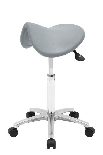 Obrotowy niski hoker. Antypoślizgowe i ergonomiczne siedzisko w kształcie siodła wykonane z miękkiego poliuretanu. Regulacja wysokości i kąta nachylenia siedziska w celu zachowania prawidłowej sylwetki siedzącej osoby. Podstawa z estetycznego i wytrzymałego aluminium. Hoker dostępny na kółkach.