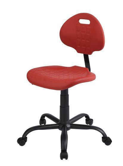 Obrotowe niskie krzesło laboratoryjne. Oparcie i antypoślizgowe siedzisko wykonane z miękkiego poliuretanu w kolorze czerwonym. Regulacja wysokości siedziska za pomocą podnośnika pneumatycznego. Solidna podstawa z poliamidu z włóknem szklanym, na kółkach.