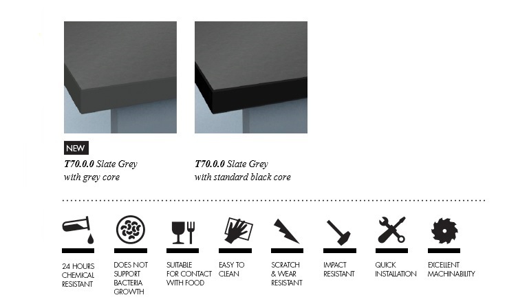 W środowisku, w którym higiena i zapobieganie skażeniu są kluczowe, płyty Trespa® TopLabPLUS® są wyborem idealnym. Dzięki unikalnej, zamkniętej strukturze powierzchni, produkty wykazują niewielką przyczepność dla zanieczyszczeń, są odporne na pleśń, gnicie oraz na rozpuszczalniki czyszczące pozbawione dodatków ścierających, co sprawia, że produkt jest łatwy do czyszczenia i dezynfekcji.