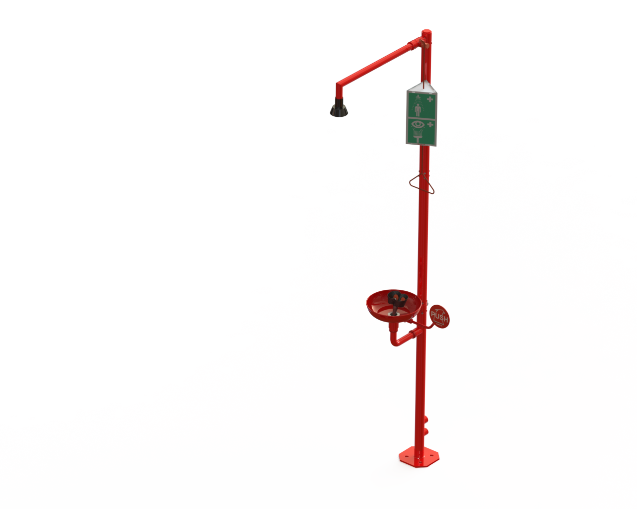 Modułowy natrysk do ciała z natryskiem do oczu/twarzy z misą, wykonany z mosiądzu i stali szlachetnej. Pokryty powłoka BROEN Polycoat odporną na chemikalia. Natrysk z głowicą samoosuszajaca się i cięgłem. Posiada wbudowany regulator FLOWFIX (26 l/min). Misa ze stali szlachetnej z wylotem.