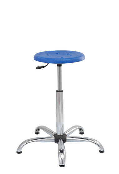 Obrotowy niski taboret laboratoryjny. Antypoślizgowe siedzisko wykonane z miękkiego poliuretanu w kolorze niebieskim. Regulacja wysokości siedziska za pomocą podnośnika pneumatycznego.  Podstawa chromowana, standardowo wyposażona w stopki;