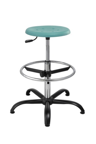 Obrotowy niski taboret laboratoryjny. Antypoślizgowe siedzisko wykonane z miękkiego poliuretanu w kolorze niebieskim. Regulacja wysokości siedziska za pomocą podnośnika pneumatycznego.  Podstawa chromowana, standardowo wyposażona w stopki.