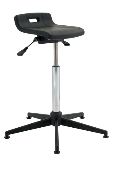 Obrotowy wysoki hoker laboratoryjny lub pomocnik do stania przy różnych pracach. Antypoślizgowe siedzisko wykonane z miękkiego poliuretanu w kolorze czarnym. Regulacja wysokości siedziska za pomocą podnośnika pneumatycznego. Podstawa metalowa czarna, wyposażona w stopki.