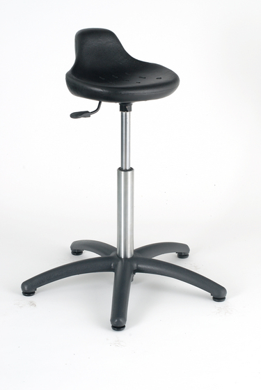 Obrotowy niski hoker laboratoryjny lub pomocnik do stania przy różnych pracach. Antypoślizgowe siedzisko wykonane z miękkiego poliuretanu w kolorze czarnym. Regulacja wysokości siedziska za pomocą podnośnika pneumatycznego.  Podstawa z poliamidu z włóknem szklanym, wyposażona w stópki.