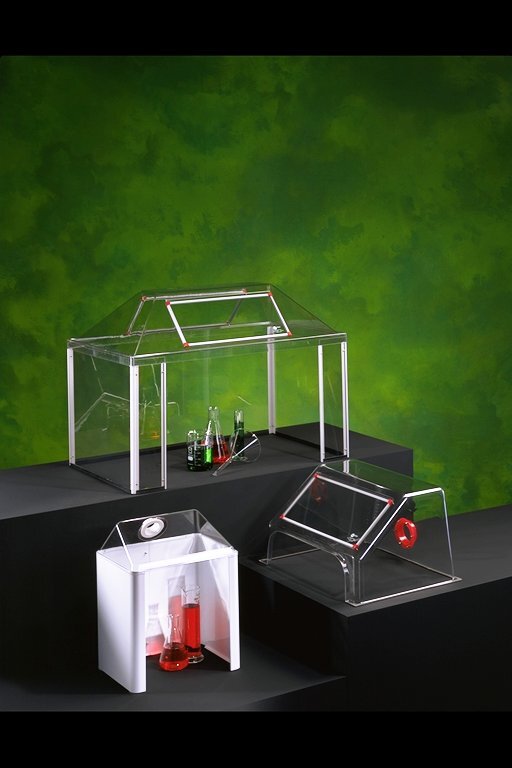 Typ 1 Pokrywa zbudowana jest z przezroczystego PETG oraz okienka wykonanego z bezpiecznego szkła zapewniającego dobrą widoczność. Przezroczyste ściany wykonane z PETG wzmocnione są aluminiowymi wspornikami na krawędziach. Są one dostępne w trzech wysokościach – 200, 500 oraz 750 mm. Wyższe komory posiadają większy otwór, więc mogą współpracować z pochłaniaczami o większej wydajności. Komory dostarczane są w zestawie do samodzielnego montażu, co zmniejsza koszty ich transportu.