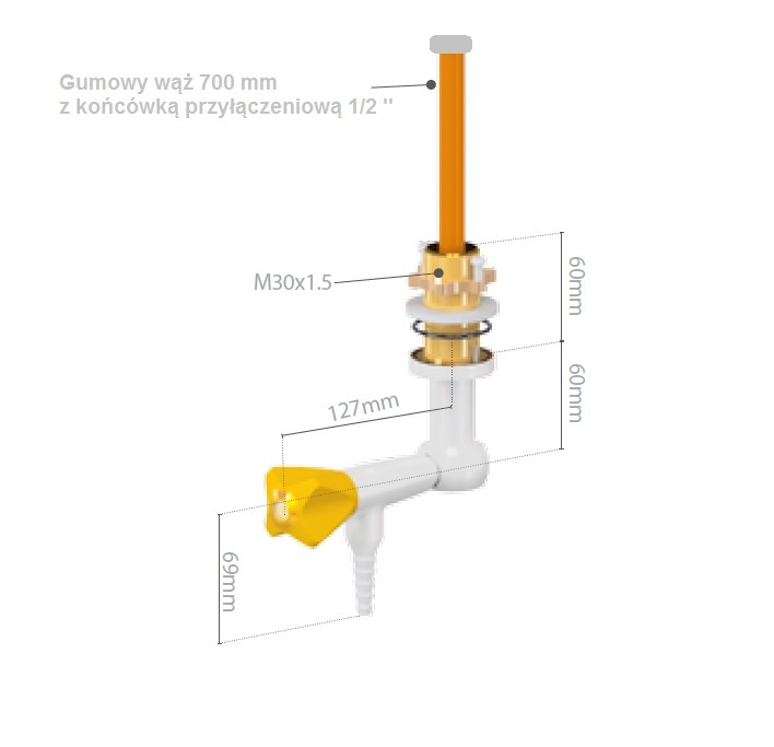 Materiał • korpus z mosiądzu tłoczonego na ciepło • wąż gumowy NBR przeznaczony do gazu 700 mm